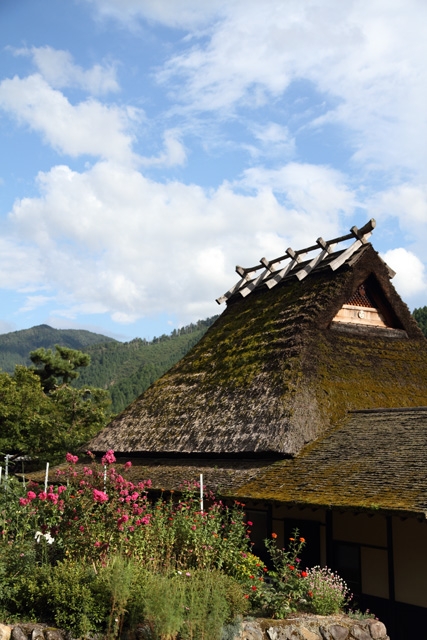 ・かやぶき屋根と秋の花